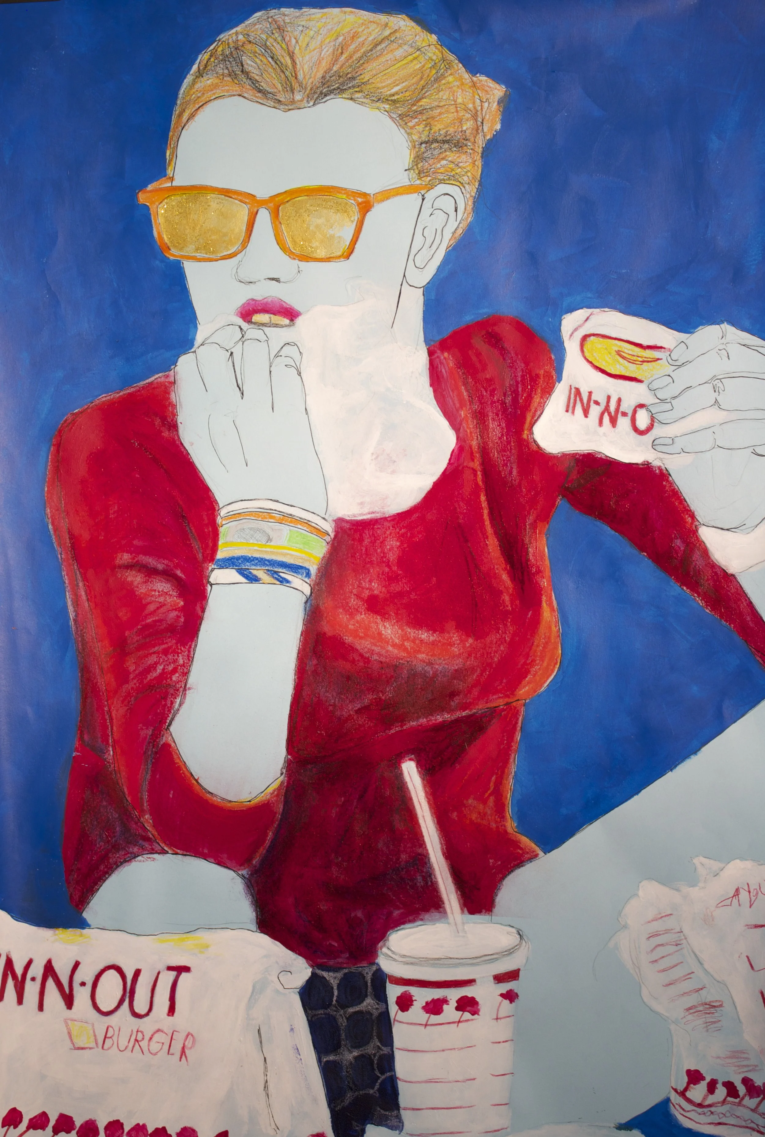 In n Out Bitch, Acrylic, chalk pastel, crayon, glitter on blue tone paper, 32 x 22 in