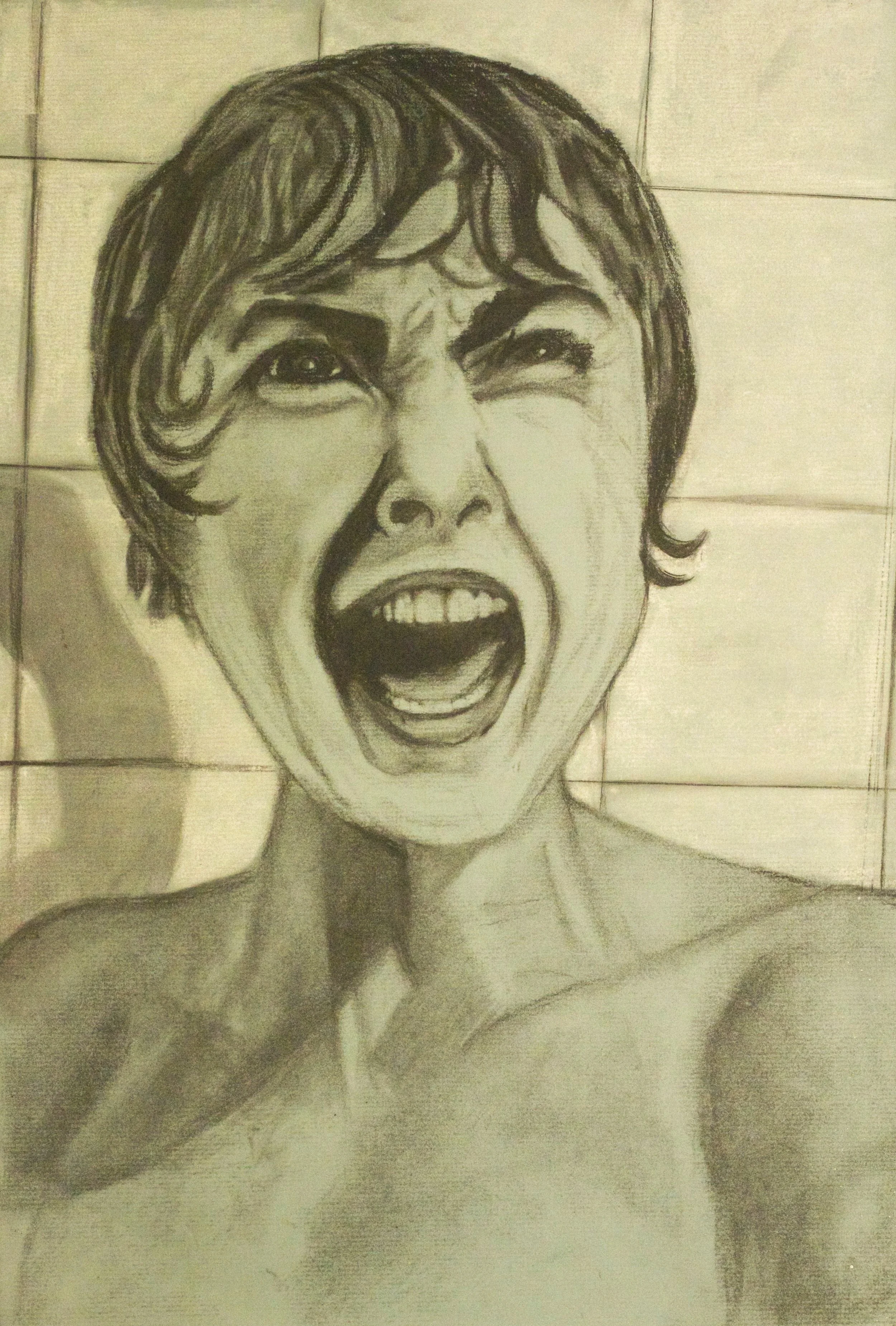 Janet Psycho Lee, Charcoal on blue tone paper, 17 x 12 in