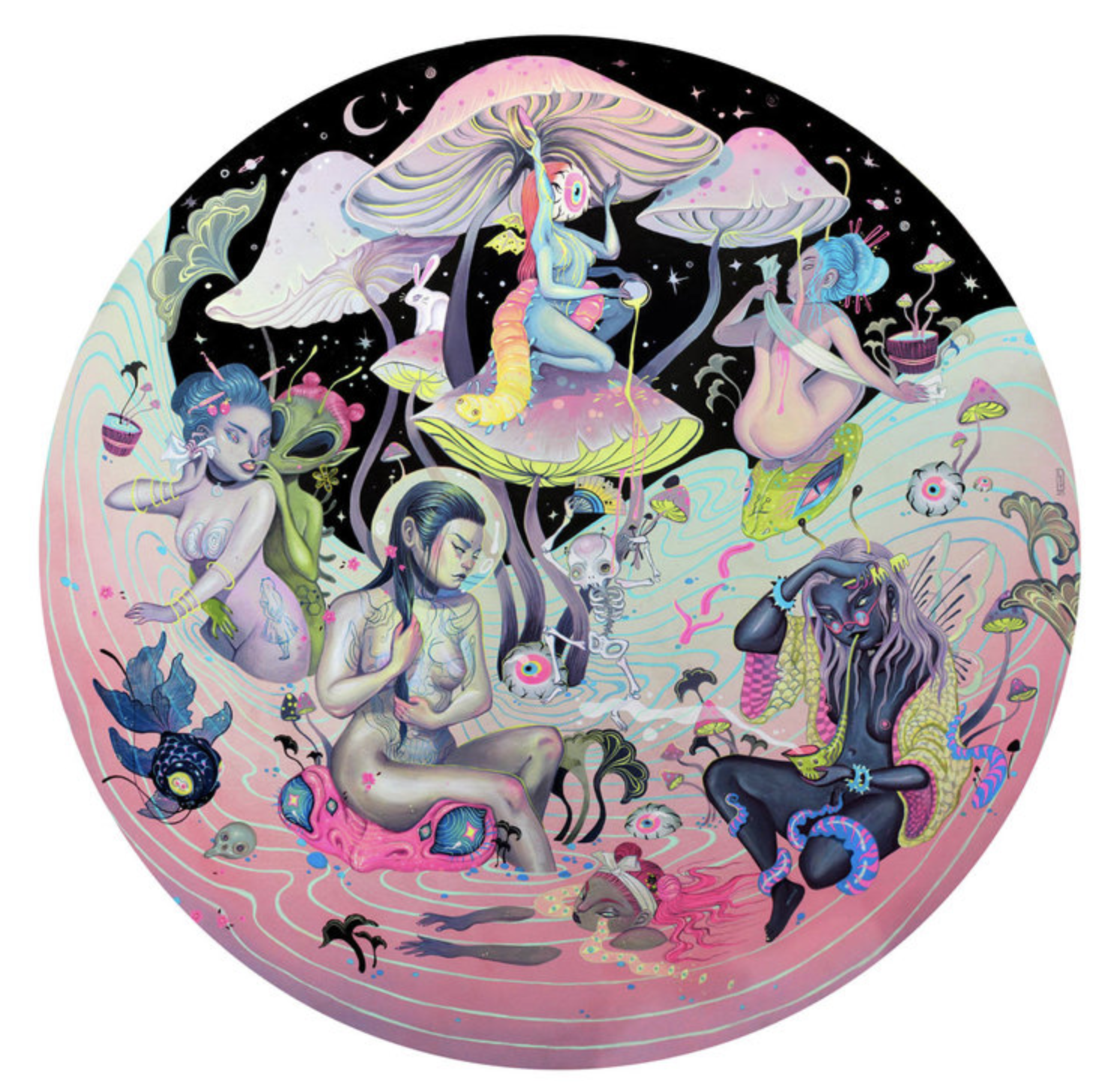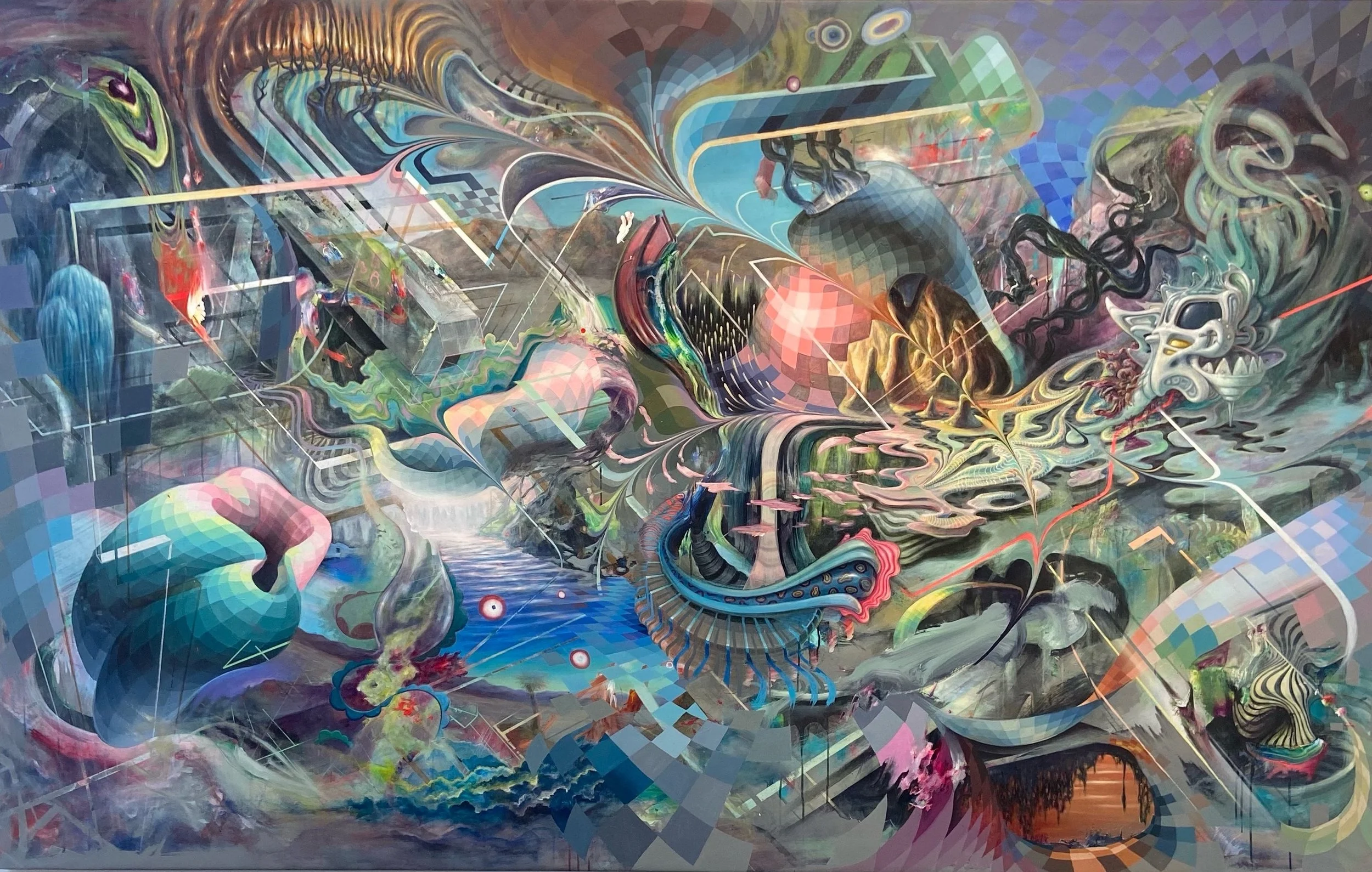 A travelling group exhibition exploring the visionary worlds of artists who delve into altered states of consciousness to create transformative, mutli-dimensional works. Drawing inspiration from psychedelic experiences,meditation, and ancient shamanic practices, these artists act as modern-day explorers of the mind, returning from inner journeys with vivid, symbolic works that transcend conventional perception. Curated by Hall Helms, Psychonauts has been presented in both Denver and San Francisco for Mirus Gallery.